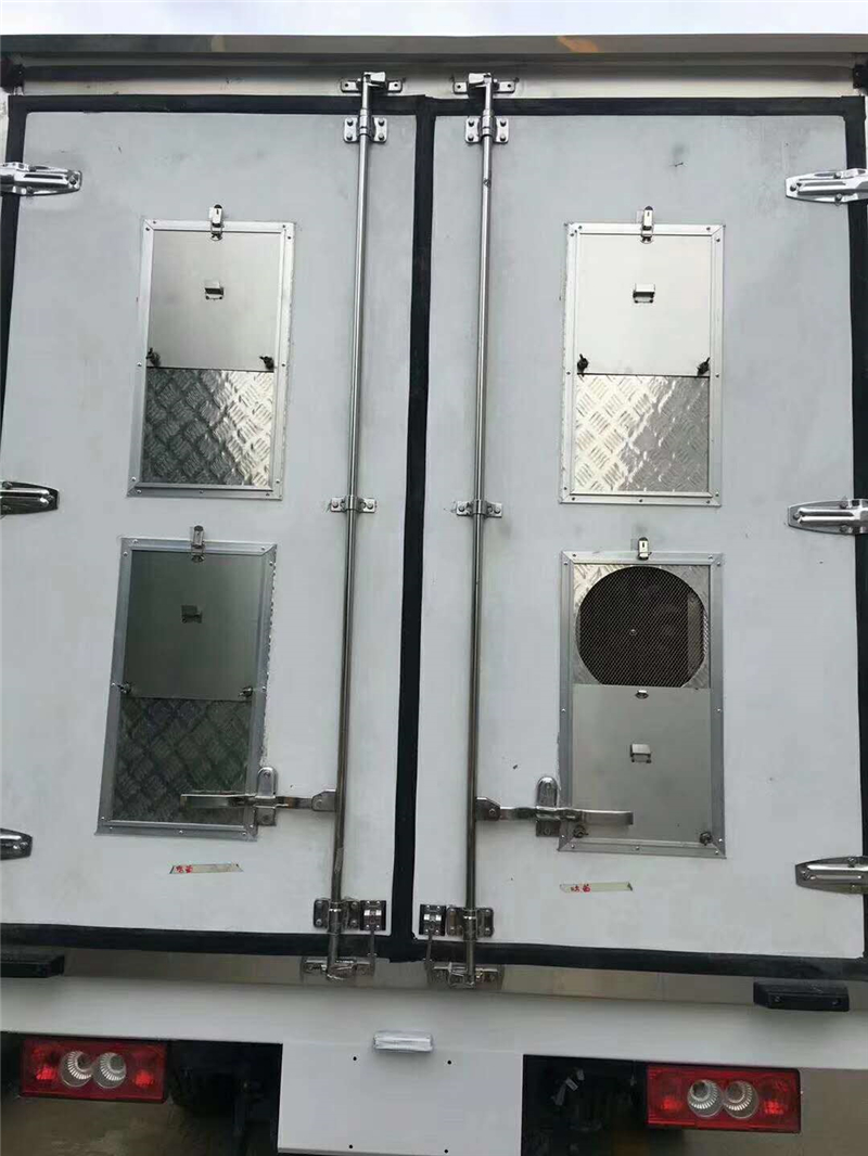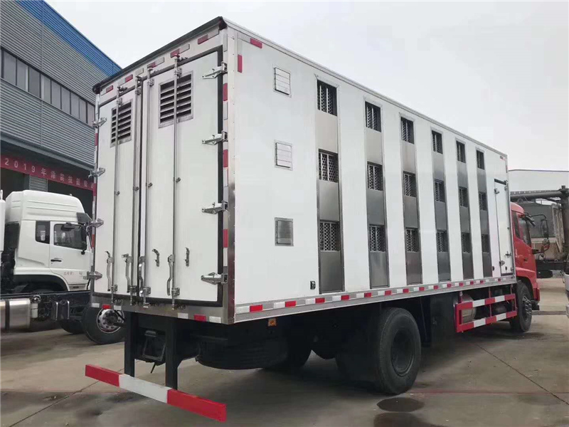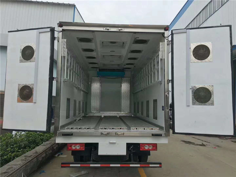 【豬苗車(chē)】上裝配置:外玻璃鋼,內(nèi)不銹鋼,兩層液壓升降層板,尾部液壓翻轉(zhuǎn)上豬平臺(tái),層板為不銹鋼骨架鋪鋁花紋板。外部電動(dòng)升降窗,排氣扇,柴油發(fā)電機(jī),暖風(fēng)加熱,喂水系統(tǒng),凈水箱、污水箱,箱內(nèi)攝像頭監(jiān)控,倒車(chē)影像,凱利制冷機(jī)組。(油暖加熱為選裝部件)