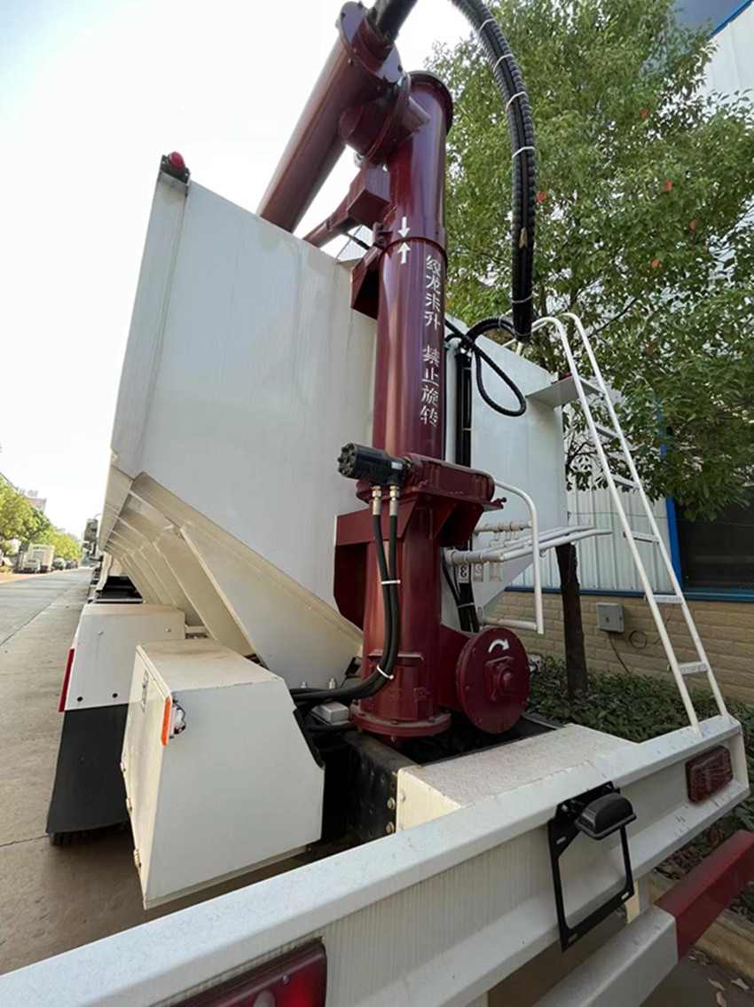 可獨(dú)立控制各分倉(cāng)卸料順序和速度,整車3條蛟龍(底部水平絞龍、尾部垂直絞龍、頂部卸料絞龍),由取力器經(jīng)車輛變速箱取力后,將動(dòng)力傳動(dòng)至高壓油泵以驅(qū)動(dòng)液壓系統(tǒng)帶動(dòng)各絞龍工作,或者由3個(gè)5.5kw 380v電機(jī)帶動(dòng)各絞龍工作,頂部絞龍液壓控制舉升,可左右旋轉(zhuǎn)180°此車公告+環(huán)保+燃油齊全,全國(guó)上戶無憂!